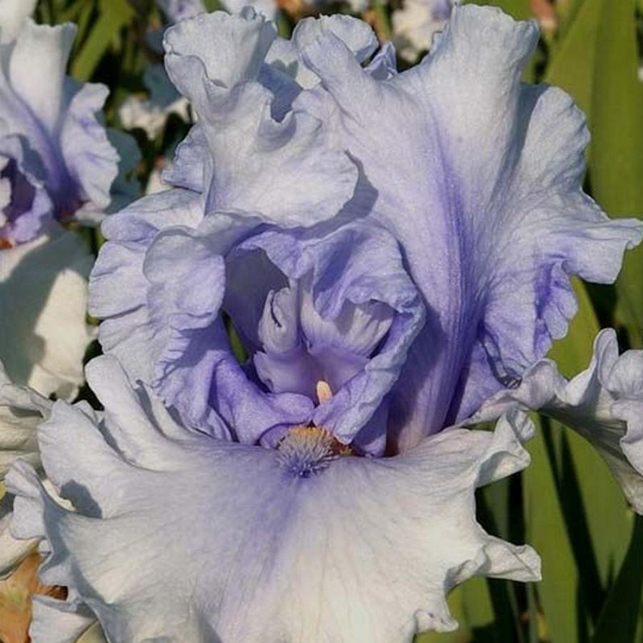 Средне-поздний ирисWilliamette Mist, очень высокий, от 100 до 120 см, привлекает внимание своими изумительными волнистыми лепестками бело-голубого оттенка, формирующими крупный бутон. Интересно смотрится бородка: она окрашена в голубые тона лепестков, но самые кончики ее как будто кто-то обмакнул в золотистую пудру. Аромат цветков приятный, но не слишком сильный. Хорошей новостью для желающих приобрести этот сорт будет то, что он весьма неприхотлив и устойчив к различным экстремальным условиям.